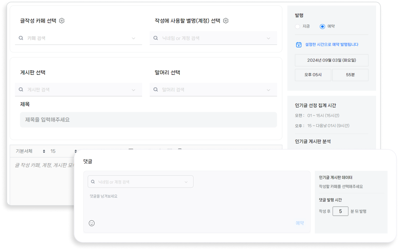 예약 기능 및 인기글 데이터를 통해 컨텐츠 발행 일정을 빠르게 정하고, 최적 시작에 배포 합니다